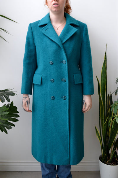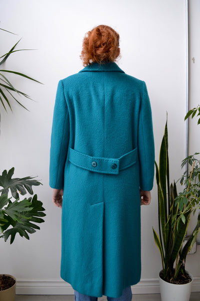 Seventies/Eighties "Rice Coat Company" Teal Mohair & Wool Blend Trench Coat. Two Hip Pockets. Notched Collar. Double Breasted. Lined.