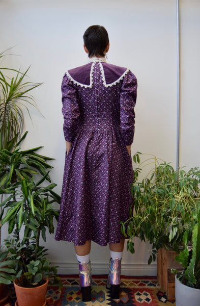 High Lace And Velvet Collar Purple Cotton Prairie Dress. Zipper Closure Up Back. Button Neck Closure. Shoulder Pads. Two Hip Pockets. Unlined.