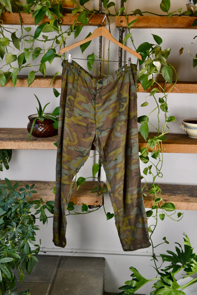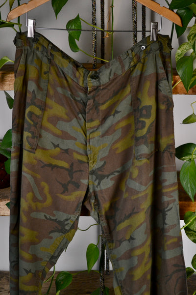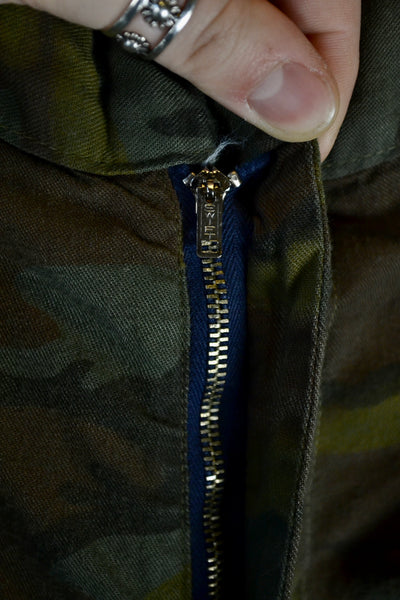 Vintage Sixties Thin Cotton Camo Pants. Metal Zipper With Button Fly. Adjustable Waist. 4 Pockets.