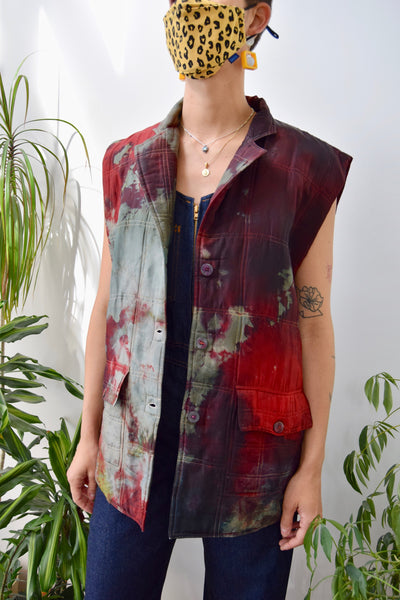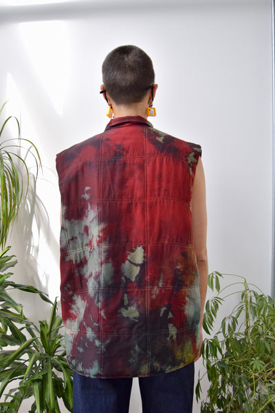 Muted Red and Green Tie Dye Silk Vest. Quilted. Two Patch Pockets. Button Closure.