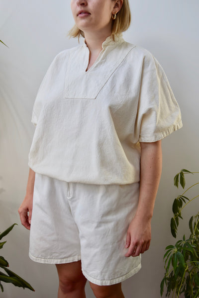 Tilley Cotton Cream Short Sleeve Blouse. Band Collar. Slit V Neckline. Elastic Waistband.