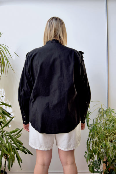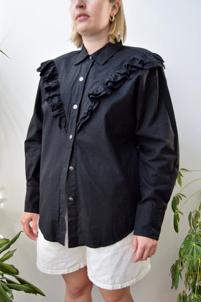 Black Western Button Up. Ruffles Along Sleeves. Metal Flower Buttons. Gather On Sleeves And Button Cuffs.