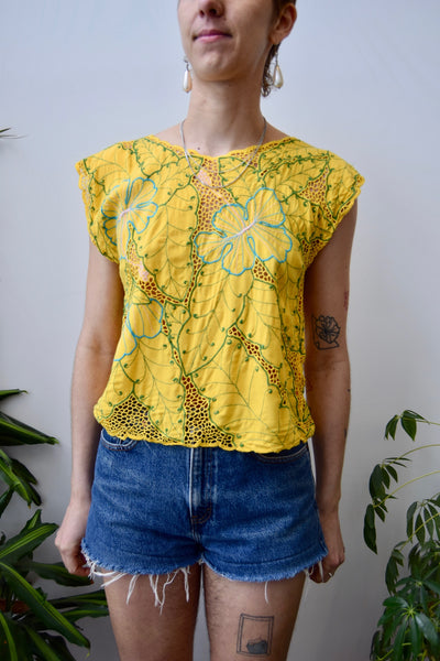 Yellow Rayon Tropical Top. Crochet Cut Outs. No Closures.