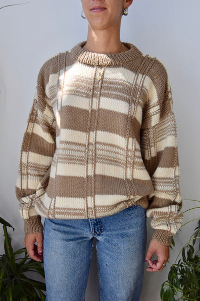 Fancy Knit Neutral Striped Wool Crew Neck Sweater.