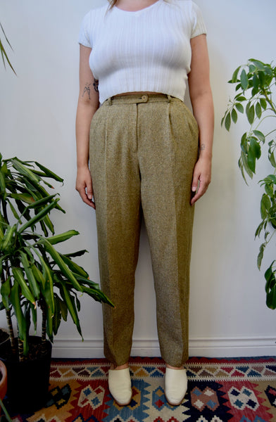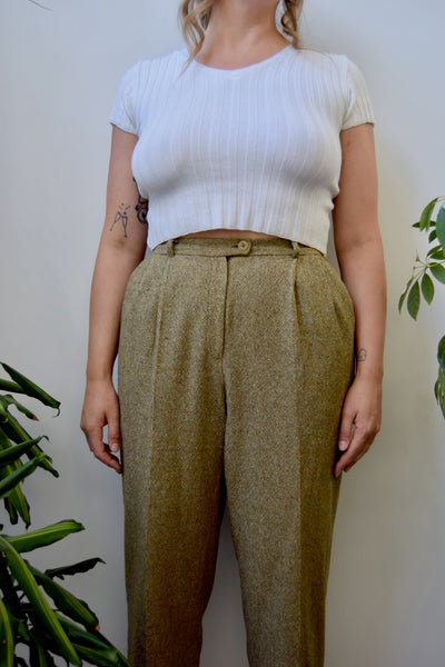 Wool Blend Tweed Trousers. High Pleated Waist. Zipper Fly. Tapered Leg. Three Pockets. Lined.
