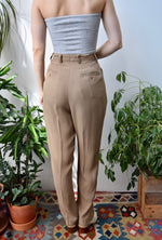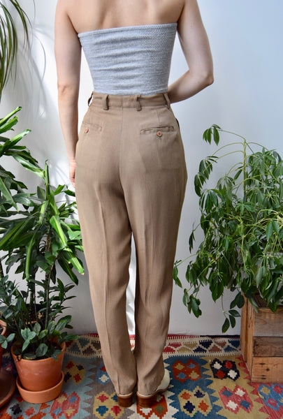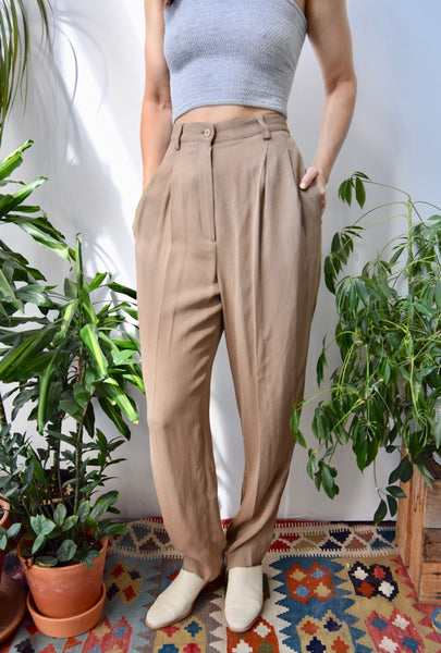 Brown Rayon Trousers. Pleated Waist. Zipper Fly. Tapered Leg. Four Pockets. Unlined.