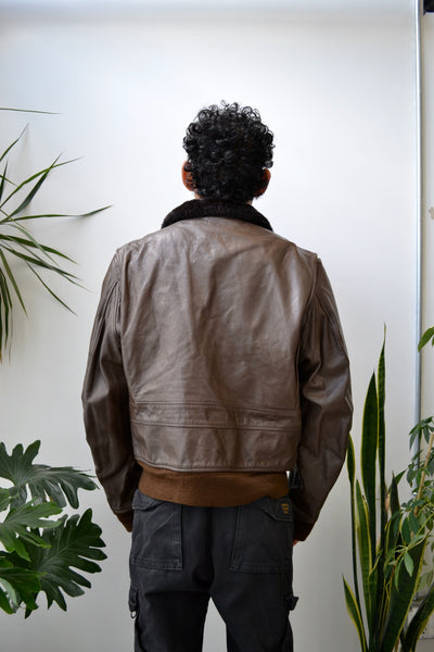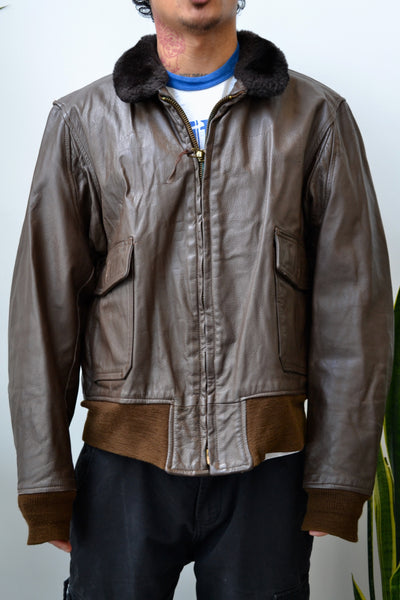 Seventies Brown Leather Flyer Jacket. Ralph Edwards Sportswear INC. Type G-1. MIL-J-7823E. Scoville Zipper Closure. Ribbed Sleeve Cuffs & Waistband. Fleece Collar. Three Pockets. Lined.