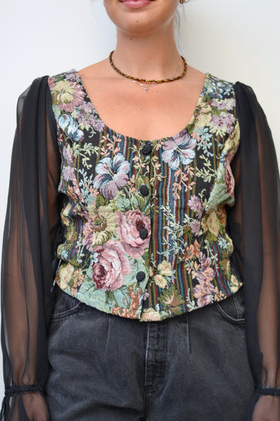 Fancy Eighties Blouse. Upholstery Vest-Style Bodice. Stretchy Jersey Cotton Back Panel. Sheer Romantic Sleeves. Button Closure Up Front. Elastic Wrists. Unlined.
