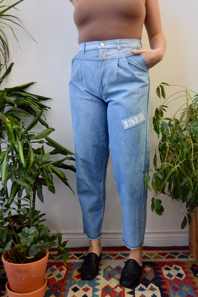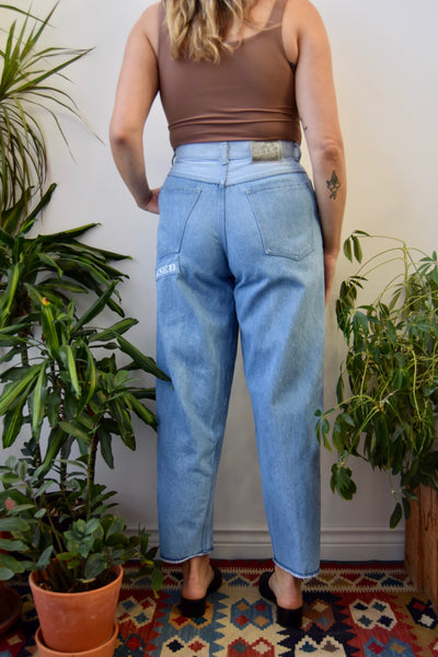 High Waisted "Used" Brand Eighties Light Wash Jeans. Tapered Leg. Pleated Top. Four Pockets. Zipper Fly. Button Waist. Three "Used" Patches On Legs.