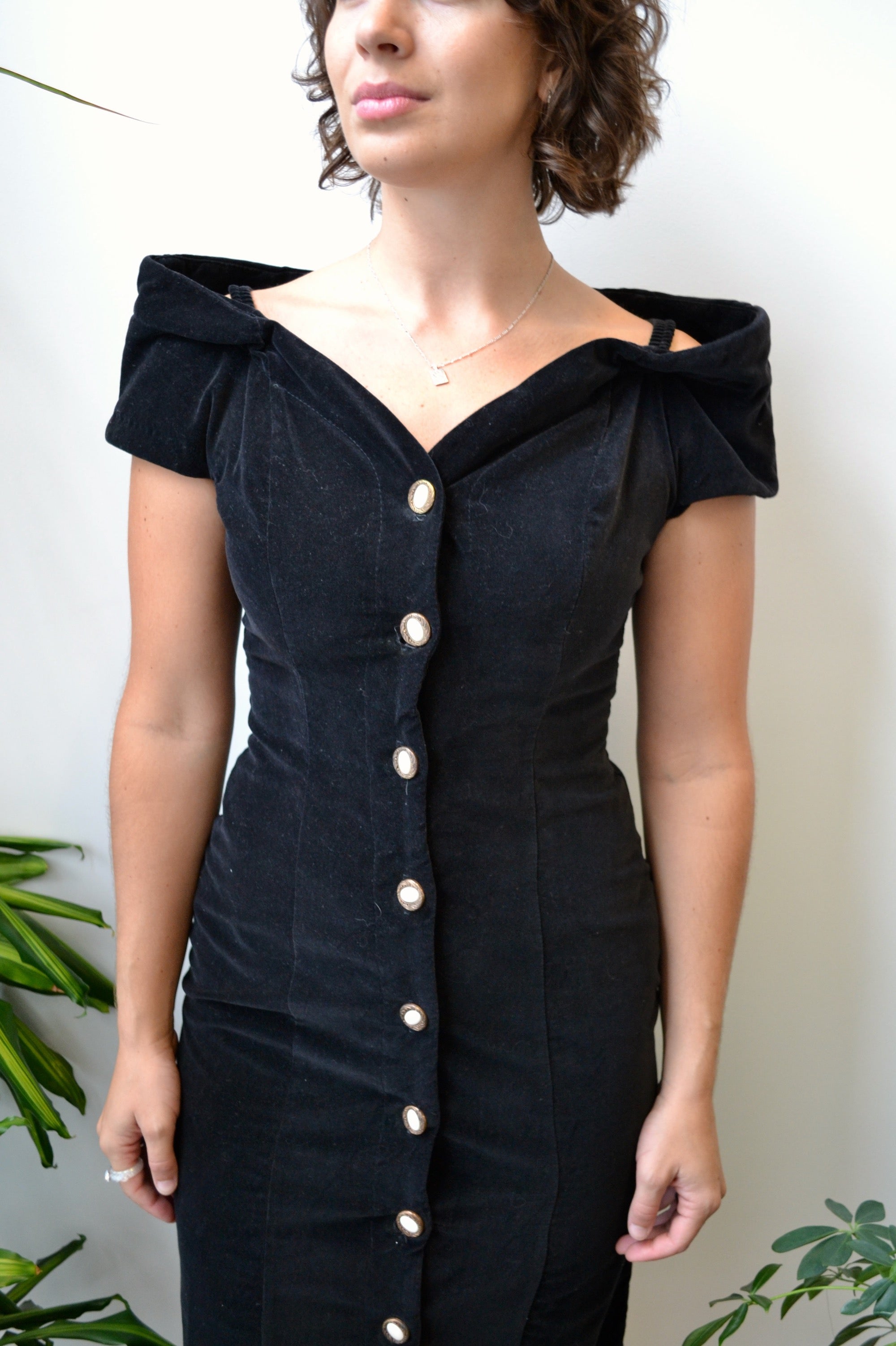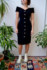 Classic Eighties Wiggle Dress. Off The Shoulder Sleeves. Elastic Shoulder Straps. Sweetheart Neckline. Button Closure Up Front. Unlined.