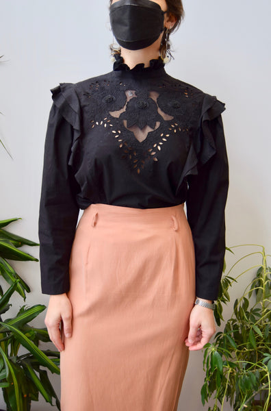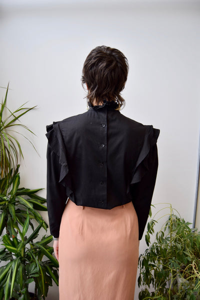 Beaded And Embroidered Black Ruffle Blouse. Eyelet And Mesh Cutout Detailing. Button Closure Up Back. Unlined.