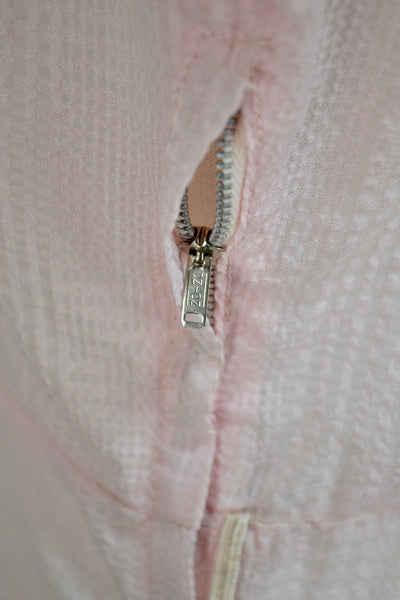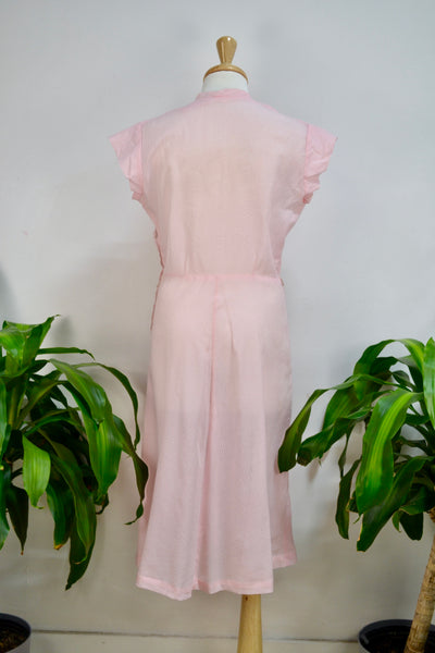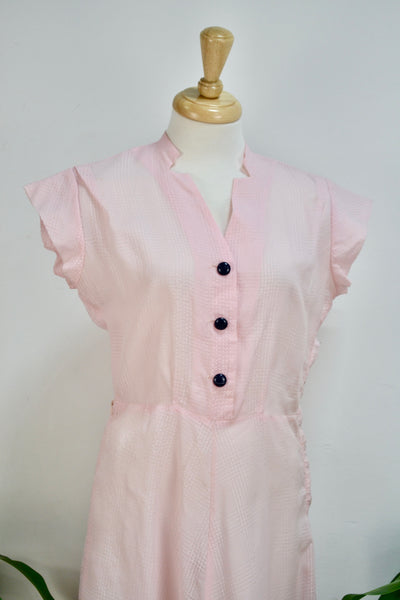 Vintage Forties/Fifties Sheer Pink Dress. Woven Plaid Design in Fabric (almost seer sucker esque). Button Closure in Front. Metal Zipper Closure on Side. Belt Loops on Sides. Cap Sleeves.