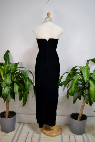 Vintage Eighties Black Velvet Halter Cocktail Dress. Keyhole Neckline. Beaded & Sequined Collar With Hook & Eye Closure. Leg Slit in Front. Zipper CLosure in Back.