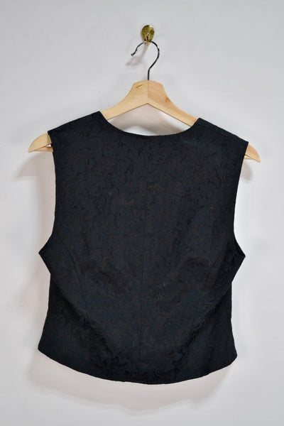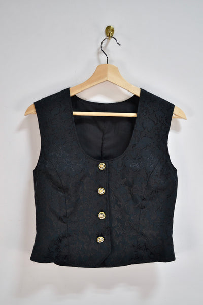 Vintage Black Filigree Patterned Vest Top. Button Closure in Front. Lined.