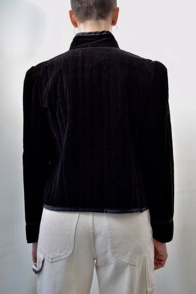 70's / 80's Black Velvet Quilted Bolero Jacket. Trimmed in Black Ribbon. No Closures. Lined.