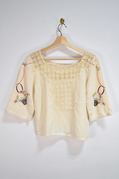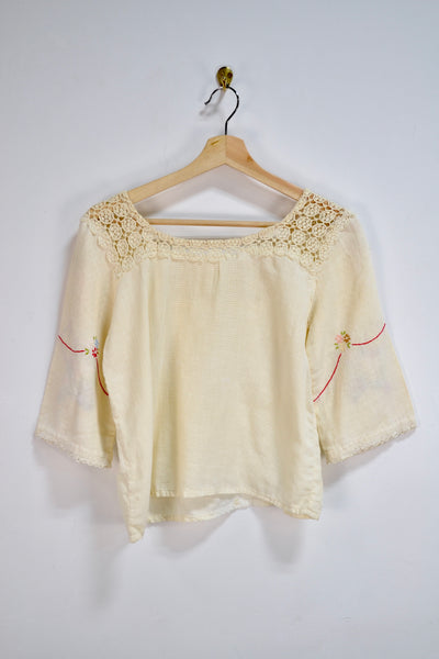 Vintage Embroidered Crochet Lace Blouse. 3/4 Sleeves. Unlined. Semi-Sheer. Crochet Lace Yoke and Collar.