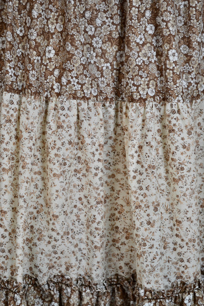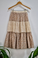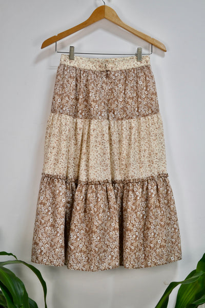 Vintage Brown Tiered Calico Prairie Skirt. Unlined. Zipper in Back with Hook & Eye Closure at Waist.