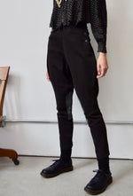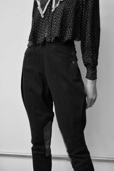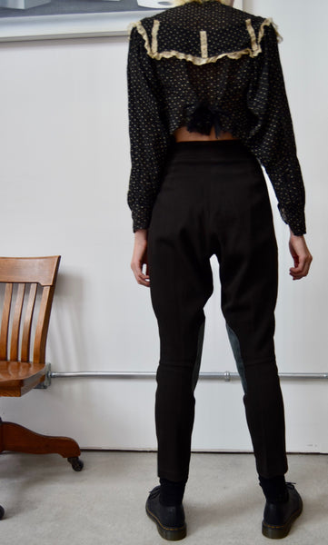 Vintage 40's/50's Charcoal High Waisted Trousers. Two Hip Pockets. Darted Waist. Button Closure at Hip. Unlined. Navy Suede Patch Details. Tapered Leg.