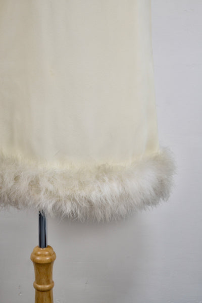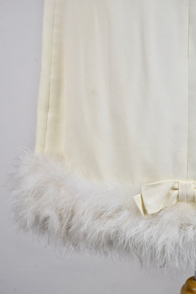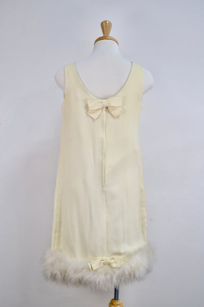 Vintage Seventies Cream Shift Dress With Feather Trim. Double Bow Detail in Back. Zipper Closure. Unlined. Chest Darts. Scoop Neck.