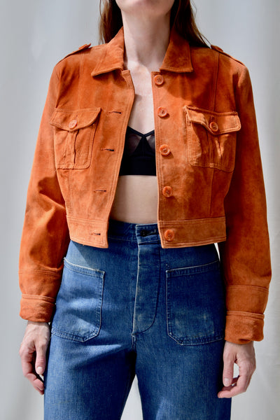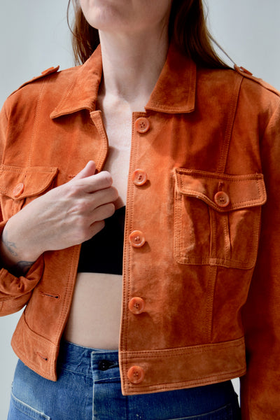 Danier Orange Suede Cropped Jacket. Collared. 5 Button Closure. 2 Button Chest Pockets. Outer Shell Genuine Leather. Polyester Inner Lining