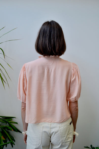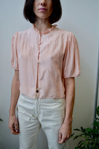 Vintage 1940's Pink Silk Blouse. Eyelet Scalloped Neckline Detail. Ruffle Collar. Four Button Closure. Balloon Sleeves. Unlined.