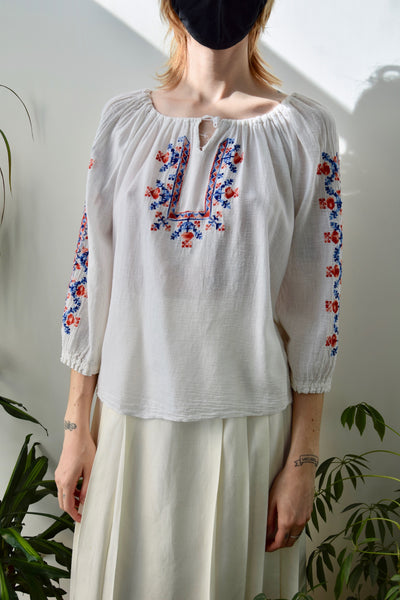 Vintage 1960's/1970's White Cotton Peasant Top. Orange, Red and Blue Embroidered Details Along Chest and Sleeves. Draw String Neckline. Sheer. Unlined.