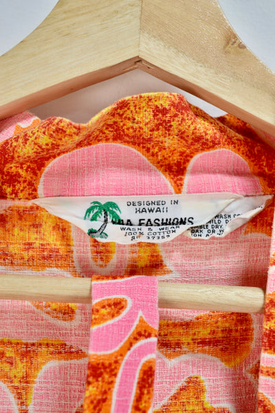 Vintage Sixties/Seventies Orange and Pink Hawaiian Barkcloth Kimono Style Robe. Two Pockets. Tie Closure. Unlined.