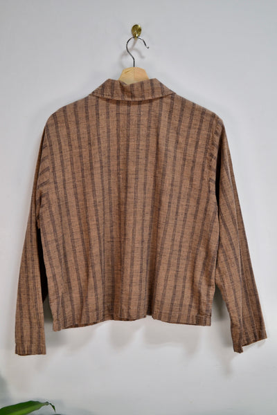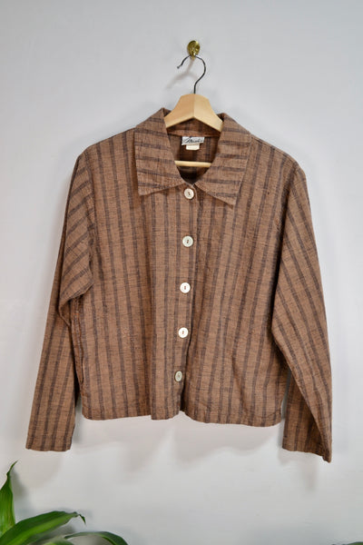 Vintage Nineties/Aughts Brown Plaid Linen Blend Shacket. Unlined. Shell Button Closure in Front. Two Pockets.