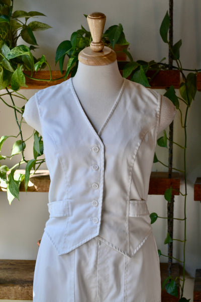 Vintage Seventies/Eighties "The Gathering Group" White Vest and Wide Leg Pant Matching Set. Button Closure on Vest. Lined. Pants Have Zipper Fly and Double Button Waist Closure.