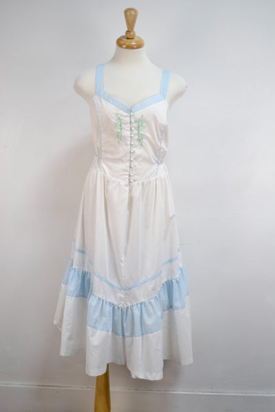 Vintage "Miss Joni" White and Blue Summer Dress. Tiered Skirt. Button Closure in Front. Tie Waist. Unlined. Floral Embroidery on Bodice.