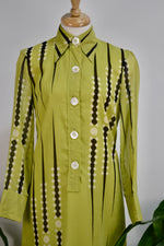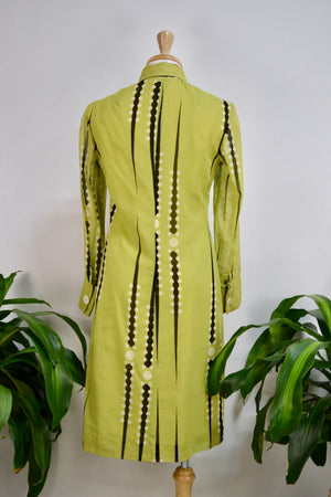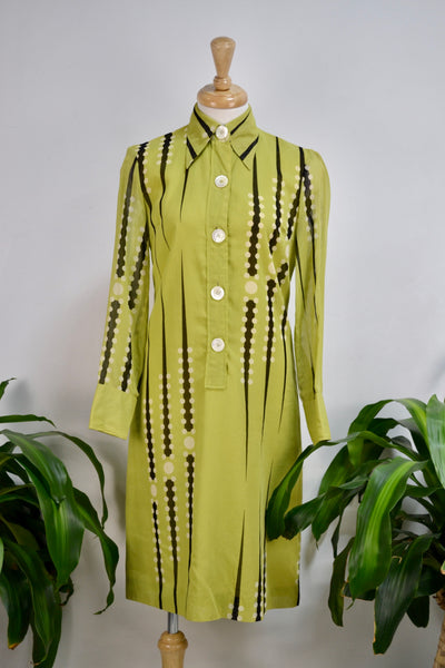 Vintage Sixties/Seventies Green Abstract Shift Dress. Pointed Collar. Shell Button Closure in Front. Lined. Semi-Sheer Long Sleeves.