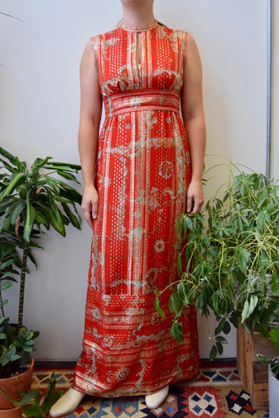 Late Sixties Peekaboo Red And Gold Sleeveless Maxi Dress. Metal Zipper Closure Up Back. Peekaboo Detail On Chest. Lined.