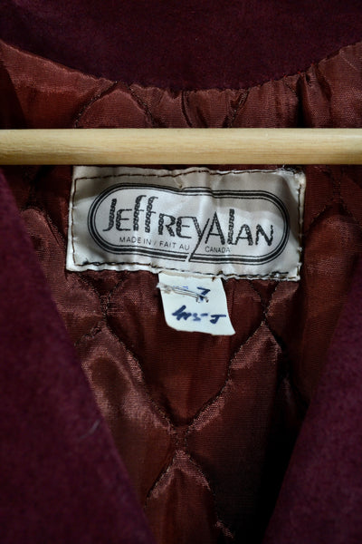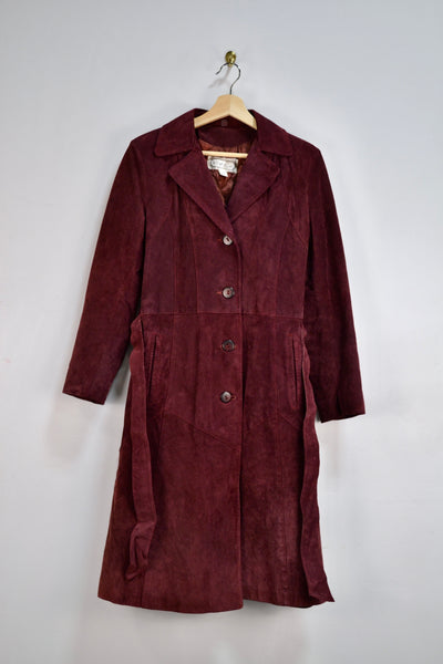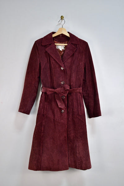 Vintage Plum Burgundy Suede Coat. Quilted Liner. Belted. Button Closure in Front. Notched Collar. Two Pockets.