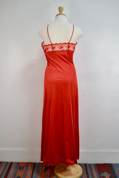 Vintage Red Nylon Slip Dress. Open Side Leg Slit. Crossover Style Bodice with Lace Trim. Unlined.