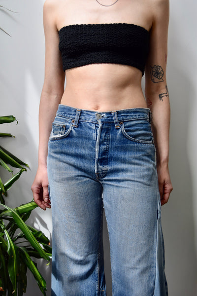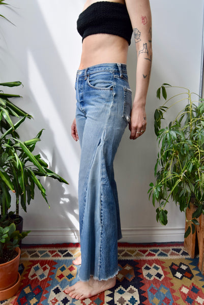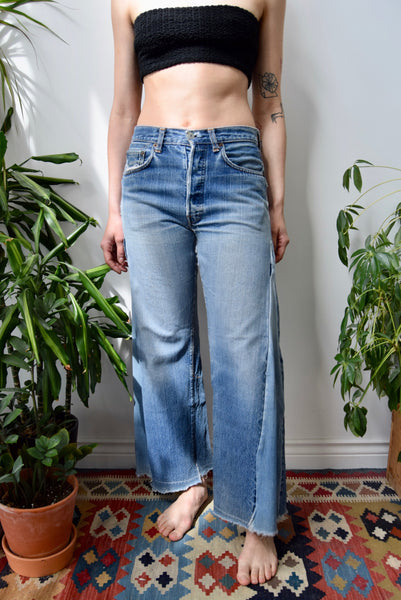 Vintage Reworked 1960's/1970's Levis 501 Jeans. Button Fly - Stamped 6. Five Pockets. Lowercase "e" Levis Tag. Selvedge/Redlines. Added Panels to make flared.