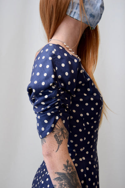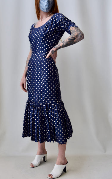 1950's / 60's Silk Polka Dot Dress With Fitted Body And Tulle Ruffle Mermaid Hem. Ruched Sleeve Detail. V Back With Back Metal Zipper And Hook And Eye Closure.