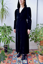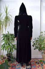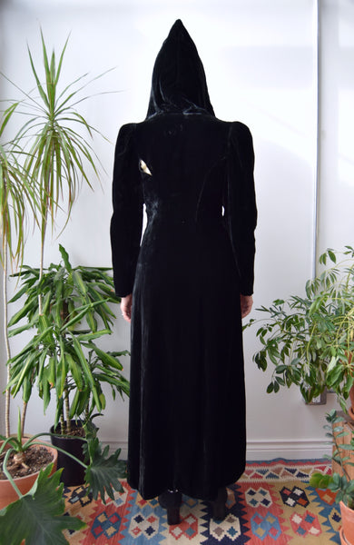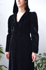 30s/40s Hooded Black Velvet Opera Coat. Wrap Closure, Inside Tie, Two Buttons On Chest. Ruched Shoulders. Shoulder Pads. Pointed Hood. Lined.