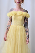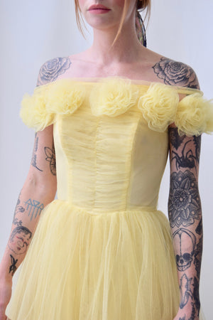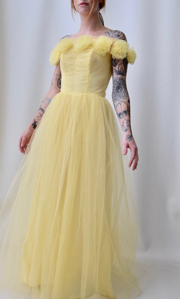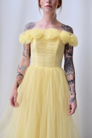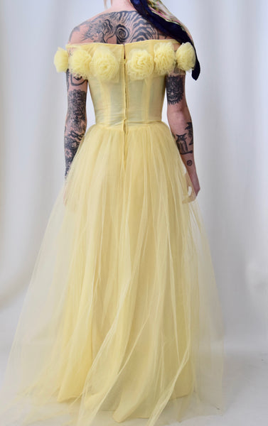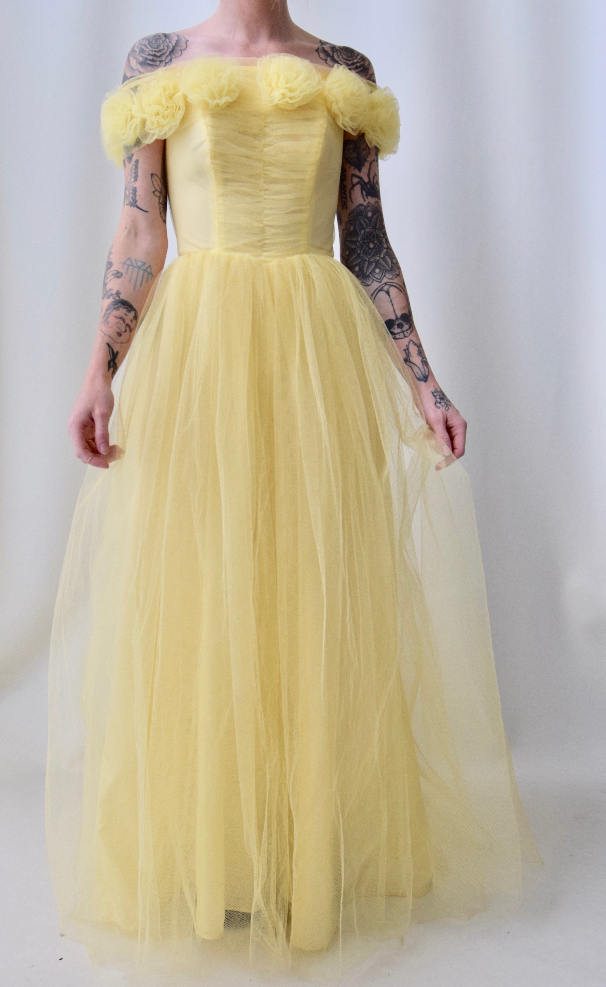Beautiful 1950's Yellow Party Dress With Boned Fitted Bodice And Fuller Skirt. Tulle Overlay Throughout, Ruching Along Bust. Tulle Roses Along Off The Shoulder Detail. Centre Back Metal Zipper Closure With Hook And Eyes.