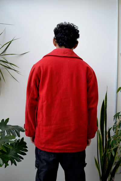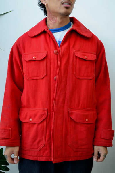 Fifties/Sixties Wards Western Field "Sold Exclusively By Montgomery Ward" Red Wool Hunting Jacket. Hidden Button Closure in Front. Quilted Lining With Inner Drawstring Waist. 8 Pockets. Rounded Collar.