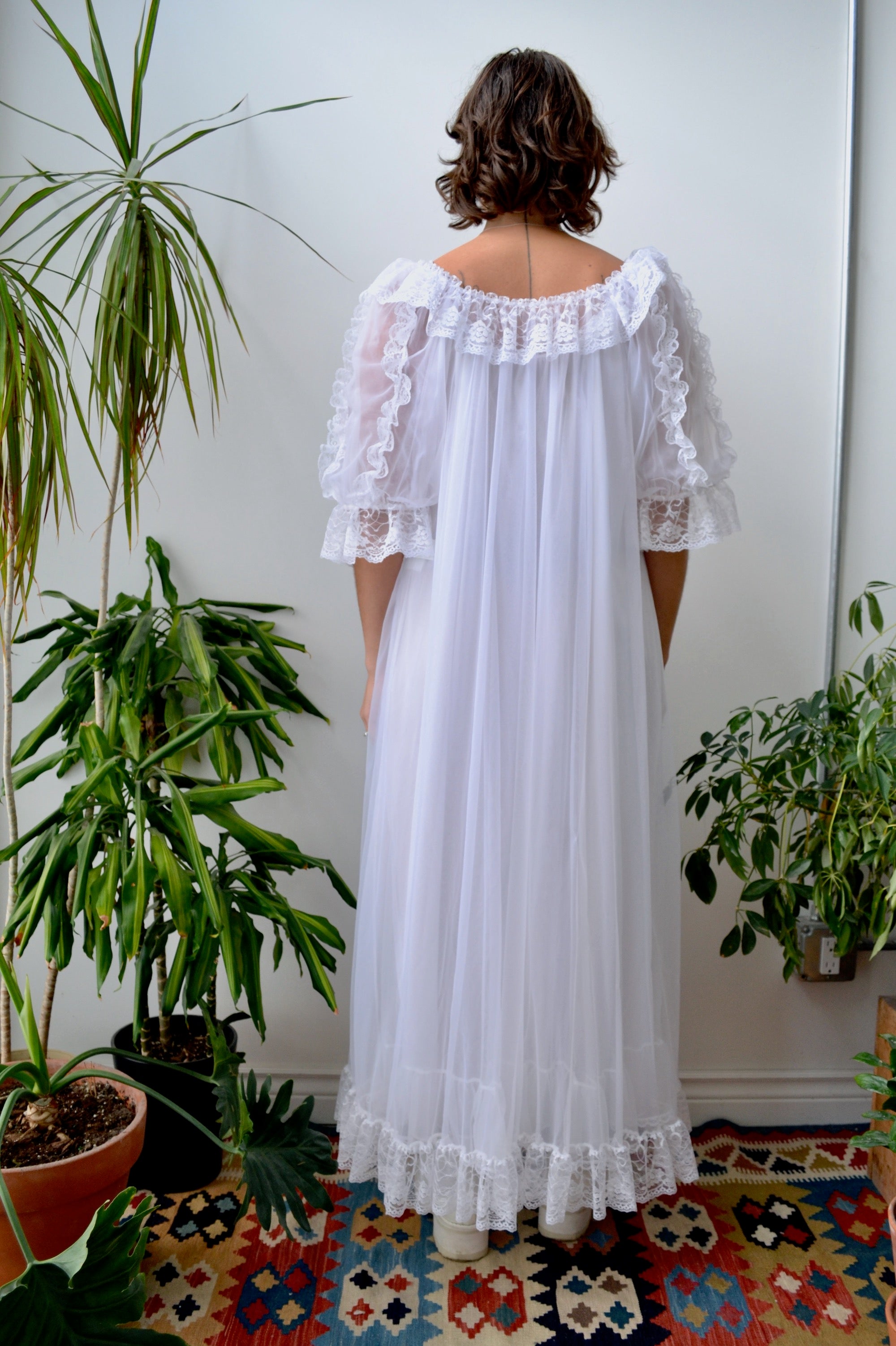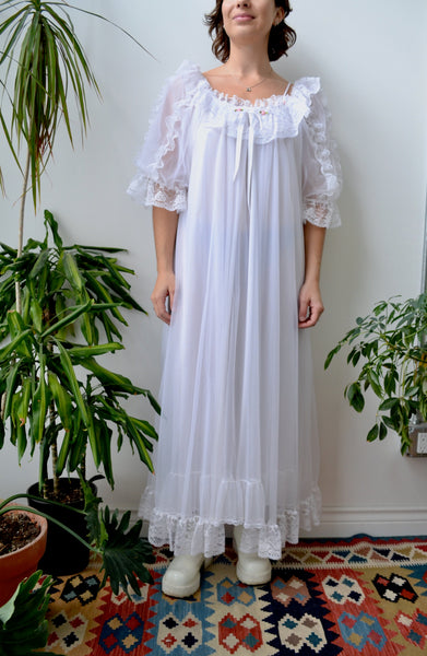 Eighties Negligee. Nightie and Robe. Lace Trim. Little Rose Details. Robe Has Ribbon Tie Collar Closure. Lined.