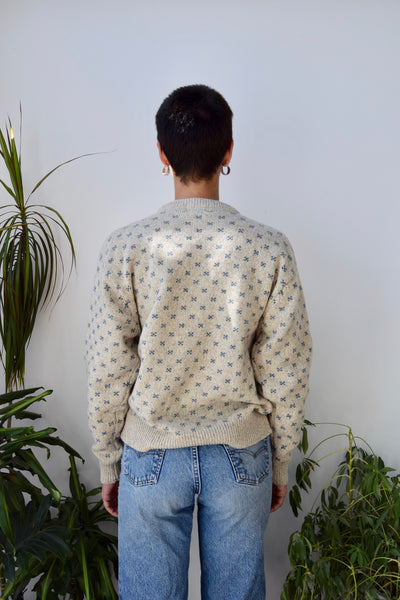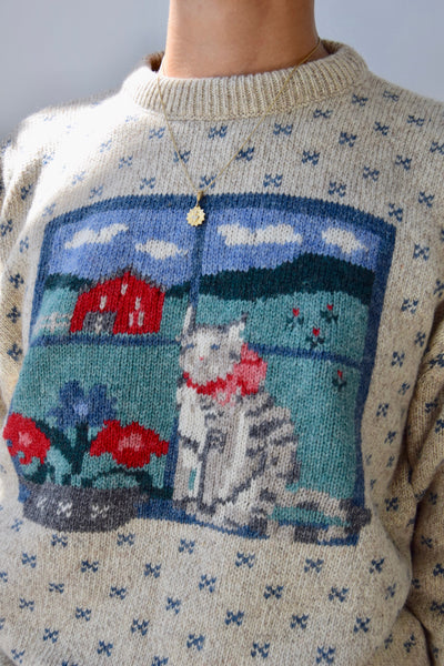 Wool Pullover Sweater With Speckled Design And Cat In The Window On Chest.