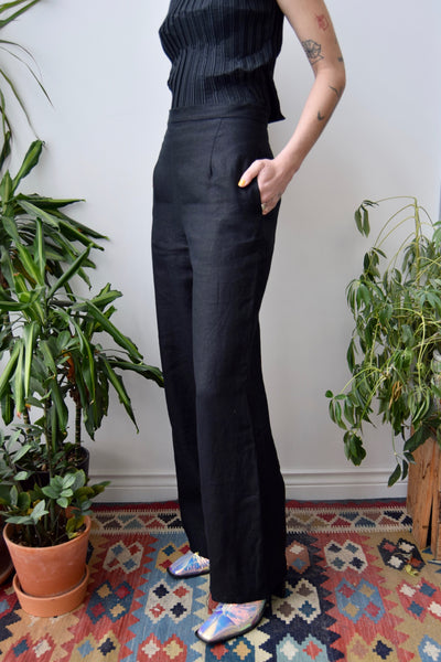 "Sunja Link" Black Linen Wide Leg Trousers. Zipper Closure Up Back. Two Hip Pockets. Unlined.