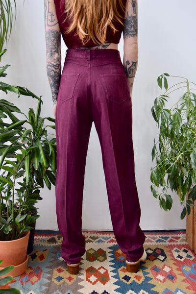 Wine Silk Trousers. High Waist. Zipper Fly. Tapered Leg. Five Pockets. Unlined.