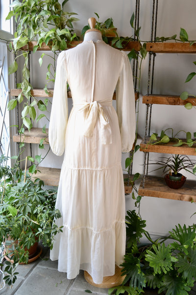 Vintage Seventies Cream Floral Renaissance/Prairie Dress. Tiered Skirt. Sheer Puff Sleeves With Elastic Cuffs. Tie in Back. Zipper Closure in Back. Lined.