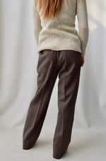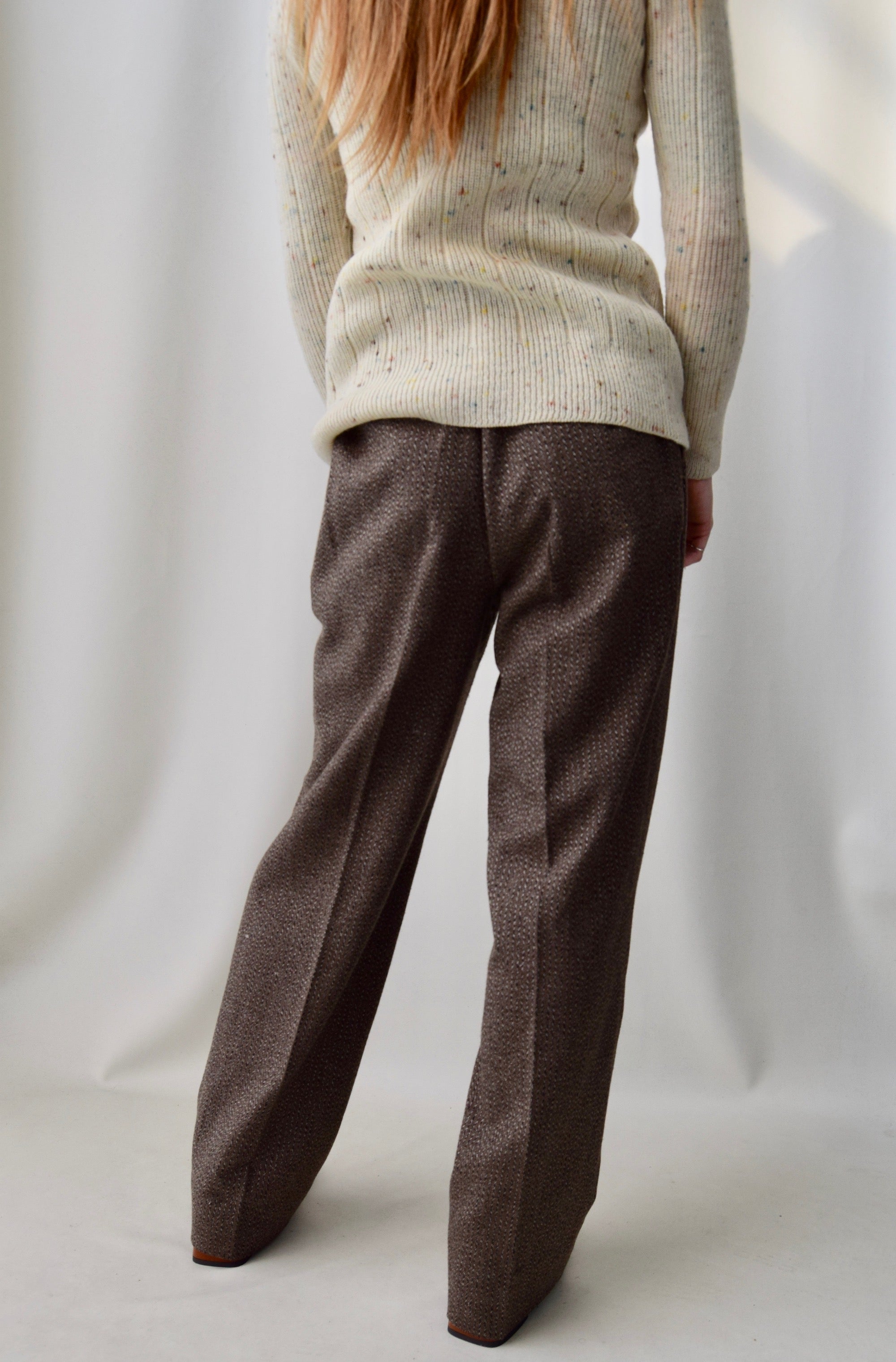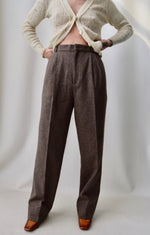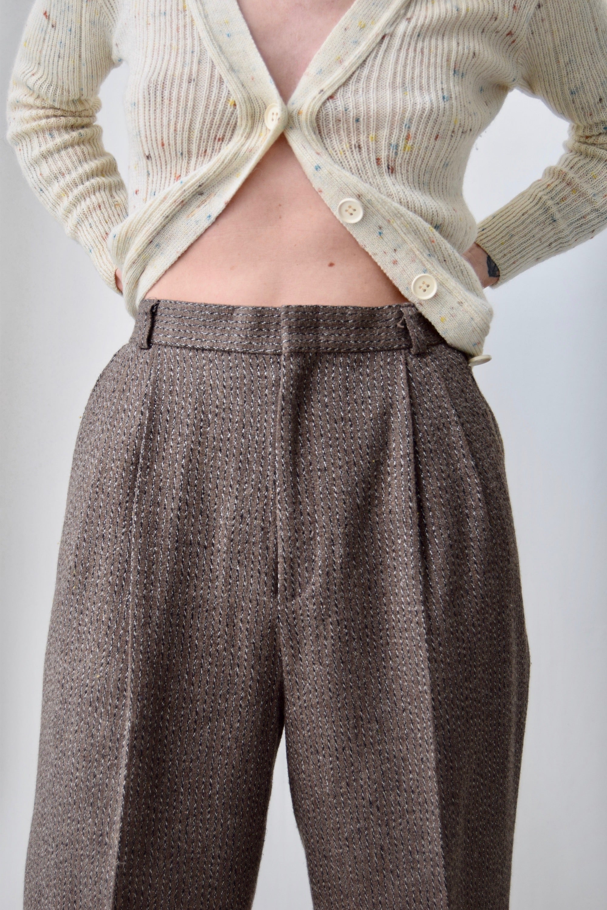 High Waisted Pleated Trousers With Belt Loops, Two Hip Pockets And Crease In Leg. Zipper Fly With Hook Closure.
